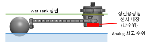 C. 바닥부에 정전 용량형 센서 내장. Analog 신호와 별도로 만수위 발생 시 Digital 신호를 출력하여 Tank의 Overflow를 사전 방지
