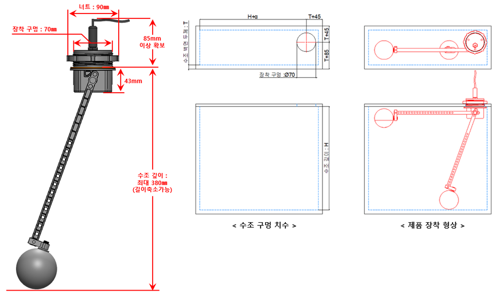 장착 치수 : 구멍 지름 70mm, 판재 두께 : 15mm(최대)