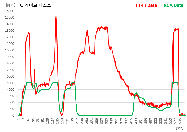 ■ CF4 "FT-IR : RGA" 비교 측정 * CF4 ND-IR Range 0 ~ 5,000ppm